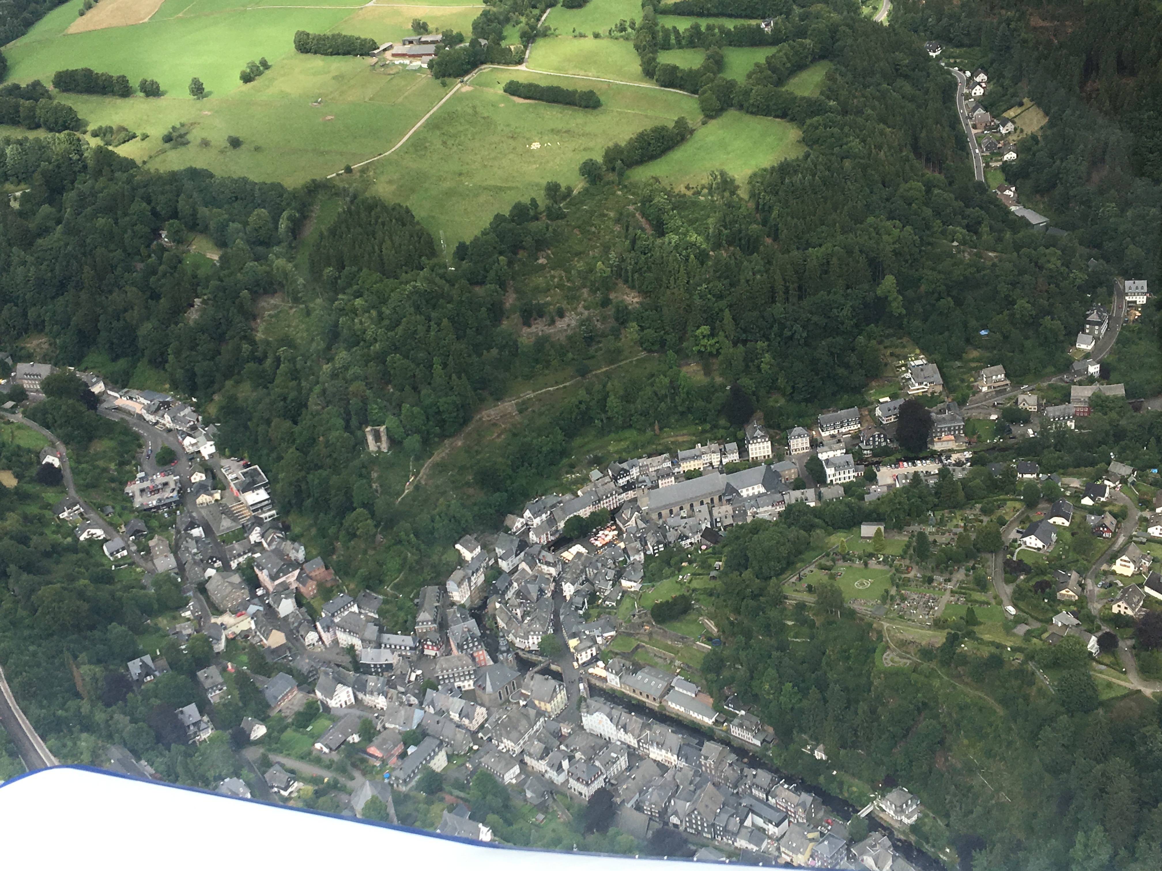 Monschau von obenNeben der beeindruckenden Natur hat die Nordeifel auch eine reiche technische und wirtschafliche Geschichte (Weberei und Tuchmacherei) und Gegenwart.
